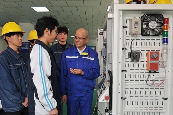 新疆昌吉回族自治州,2023年“大国工匠年度人物”张国云正在给昌吉职业手艺学院能源动力工程分院的学生进行指点。视觉中国供图。