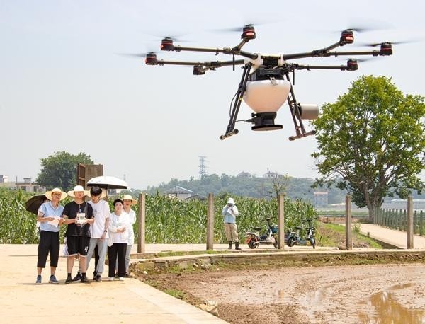 华中农业大学动物科学手艺学院校内实践讲授,聪慧农业专业的学生们正正在进行无人机施肥操做。受访者供图。